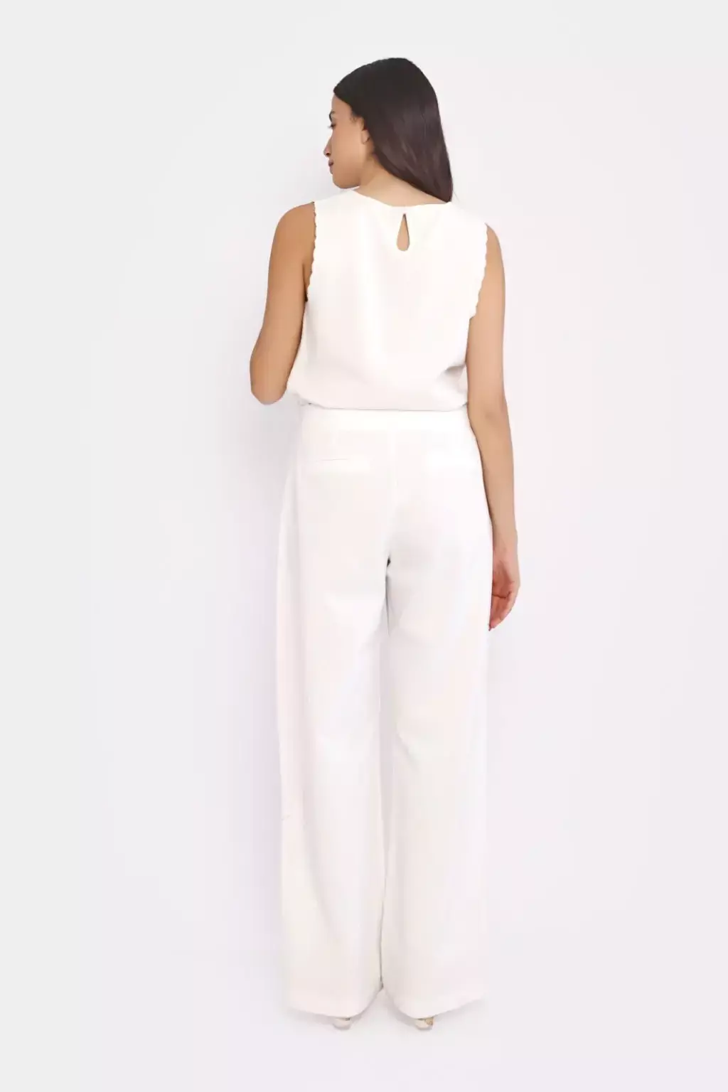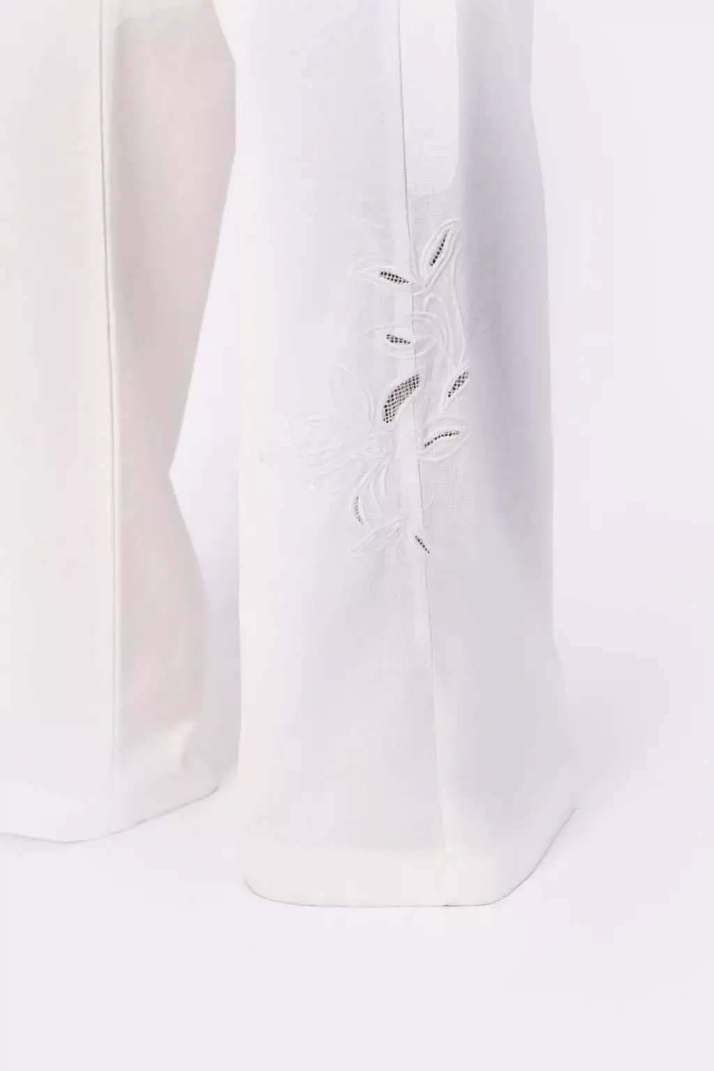 Pantalón confeccionado en lino con bolsillos laterales. Posee bordado y calado en piernas con diseño exclusivo de la colección. Pretina corrida y terminación de cintura con bordado en forma de ondas.
