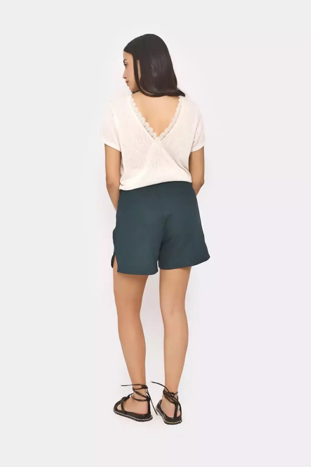 Remera Escote Redondo, En Lino De Punto. Con Espalda En V Y Detalle De Puntilla.
